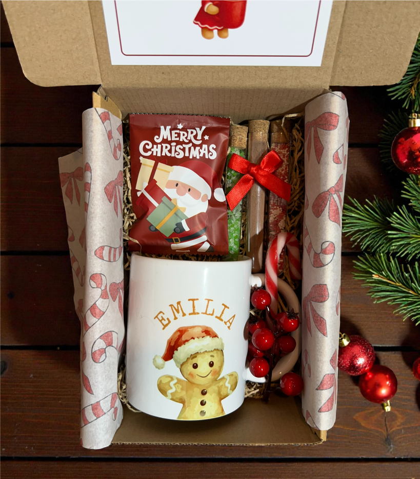 Eine liebevoll zusammengestellte Geschenkbox mit personalisierter Tasse – perfekt für gemütliche Wintermomente.