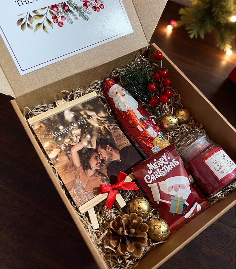 Eine liebevoll zusammengestellte Weihnachts-Geschenkbox mit personalisiertem Holzaufsteller, Kerze, Schokolade, gemischten Nüssen und festlicher Dekoration – perfekt als besonderes Weihnachtsgeschenk.