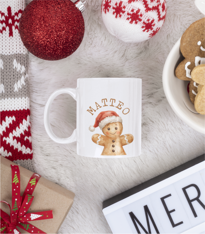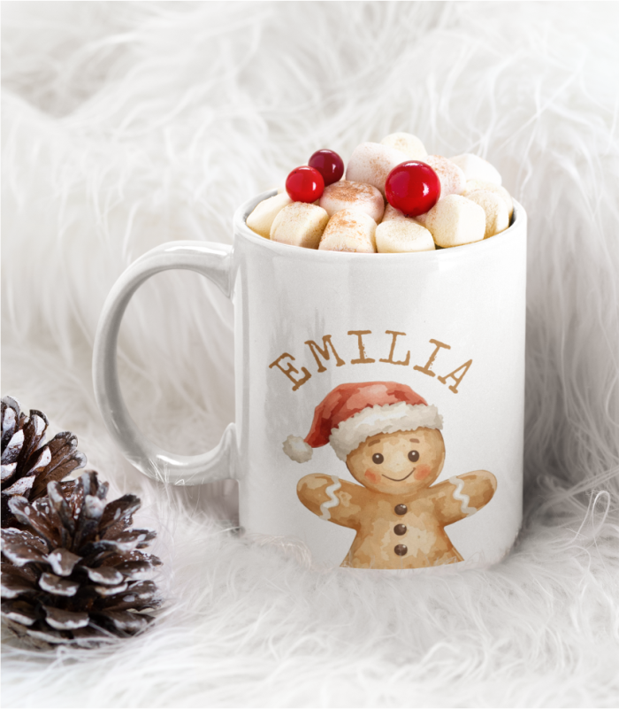 Genieße die Weihnachtszeit mit einer personalisierten Tasse featuring einem süßen Lebkuchenmann mit Weihnachtsmütze. Mit individuellem Namen, das perfekte Geschenk für die Festtage.